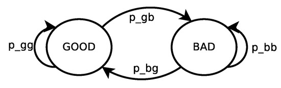 In the two-state model, we define a cumulative Bad state , grouping together the Bad and the Medium states used in the three-state model. The probabilities of successful reception given a channel state are computed link-wise by taking the average PERs in each state. The transition probabilities, instead, are computed starting from the three-state model transition probabilities as:
