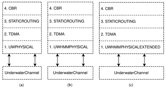 The three communication stacks compared in simulation, all composed of a constant bitrate application layer, static routing, and TDMA, and a different physical layer: Uwphysical (a), UWHMMPhysical (b), and UWHMMPhysicalExt (c).