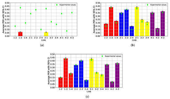 Uwphysical (Figure 9a) is extremely optimistic and provides a very low PER. In particular, with the considered settings the PER of the links is equal to zero up to a transmission range of 1.1 km, and increases to 1 when the distance between nodes is more than 1.6 km. This implies that the link connecting the two farthest nodes (node 1 and node 3, that are 1.2 km from each other) has a non-zero PER, but still the real values are underestimated. Conversely, the PER obtained both with the two-state (Figure 9b) and with the three-state (Figure 9c) models is very similar to the one observed in the sea trial, with the three-state model having a PER that almost perfectly (within the CI) matches the experimental one (depicted with green diamonds), definitely outperforming the other two models.