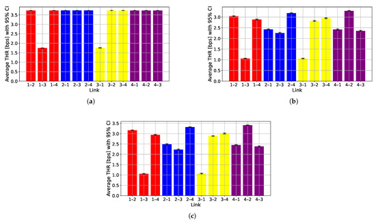 Similarly, the throughput observed with Uwphysical (Figure 10a) is almost the same for all of the links, and is equal to 3.7 bps: only in the link between node 1 and 3 the throughput is approximately 1.85 bps, as that link was removed at the simulation time 9000 s, when the network topology was changed from topology 1 to topology 2. With a higher PER per link, the throughput observed with the two- and three-state HMM is significantly different link by link, presenting results that are definitely closer to those that can be observed during a sea experiment.