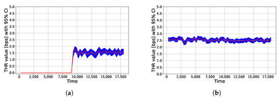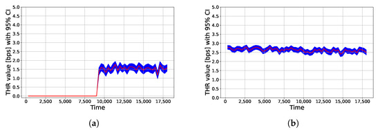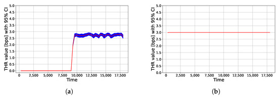 “Instantaneous” throughput values yielded by UWHMMPhysicalExtended module from node 1 to node 3 (a) and from node 4 to node 2 (b).