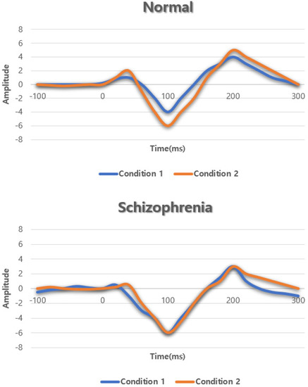 EEG was measured in a total of 70 channels by measuring 64-channel scalp EEG and 6 channels around the eyes and nose. In this study that compared the N100 differences between schizophrenic patients and healthy subjects, among the 70 analyzed channels, 9 electrode sites (Fz, FCz, Cz, FC3, C3, CP3, FC4, C4, CP4) had distinct N100 differences. Figure 1 shows the N100 difference between schizophrenic patients and healthy subjects in the Fz channel. As a result of the analysis, in the case of the healthy subjects, N100 was more suppressed in Condition 1 than in Condition 2, but in the case of schizophrenic patients, it was demonstrated that there was no difference between Conditions 1 and 2.