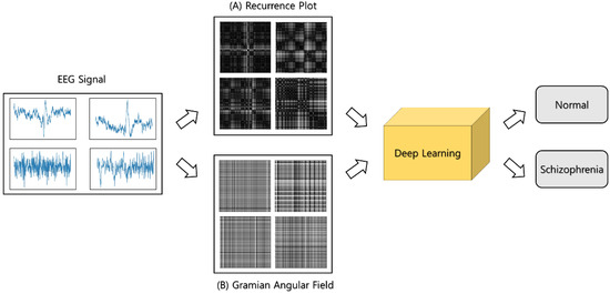 In order to differentiate EEGs of schizophrenic patients from the general public with high accuracy, this study proposed a method of improving diagnostic accuracy by converting EEG, a time series data, into images and then learning in deep learning models. Recent study results showed that a method converting time series data into an image, which was then learned and classified in a deep learning model, demonstrated higher classification accuracy when compared to a method without conversion [9,10]. Based on these insights from prior research, this study used a method of learning deep learning after converting EEGs into images to increase diagnostic accuracy.