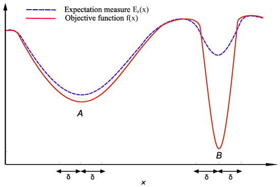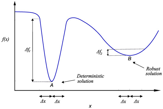 where is the probability density function of a multivariate normal distribution with mean and covariance . This expectation measure is, in essence, the expectation value of the cost function under perturbation [29]. Figure 3 illustrates the optimal solution resulting from minimizing an objective function (point B) versus its corresponding expectation measure (point A). Solution A is considered robust, as for a small amount of perturbation of the design parameters, the objective function value of the solution does not change significantly. Solution B offers a better minimum, but it is sensitive to perturbations: it may not be suited for the application at hand.