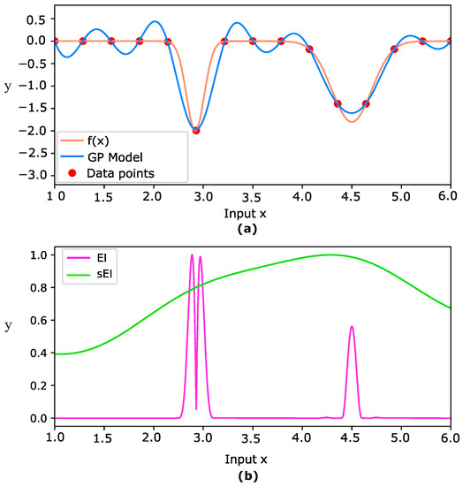 Among the most commonly used acquisition functions are the Expected Improvement (EI) [47,48] and Probability of Improvement (PoI) [49]. In particular, a stochastic version of EI is adopted in this manuscript (see Section 3). Traditional EI is defined as: