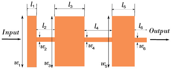 The two-port lowpass stepped impedance microstrip filter presented in [57] is studied in this section. The filter is formed by six microstrip line sections with different lengths , …, while the following relation holds for their widths [57]: and . The corresponding filter layout is presented in Figure 5. This filter operates in the GHz band, and resides on a substrate with a relative permittivity and thickness mm. The nominal values of its geometrical parameters are shown in Table 1. The simulator used to estimate the filter’s performance is the MATLAB RF Toolbox (Mathworks Inc., Natick, MA, USA).