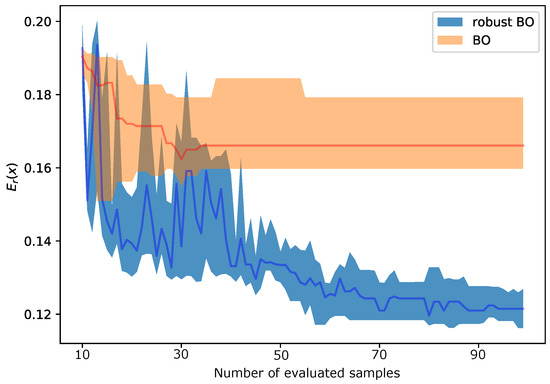 Results are shown in Figure 6, which illustrates the progression of the robust measure with respect to the number of simulations performed for both BO and the proposed robust algorithm. The proposed optimization method clearly outperforms BO to find a robust optimum, and the difference already becomes clear after a few iterations.