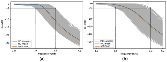 (a) Transmission characteristic of the lowpass filter using the robust methodology and (b) standard BO. (a) The optimal 3 dB cut-off frequency found by the robust BO is 2.38 GHz, and MC analysis reveals that it varies in the [1.9, 2.8] GHz range; (b) The optimal 3 dB cut-off frequency found by the standard BO is 2.40 GHz, and MC analysis reveals that it varies in the [1.8, 3.3] GHz range.