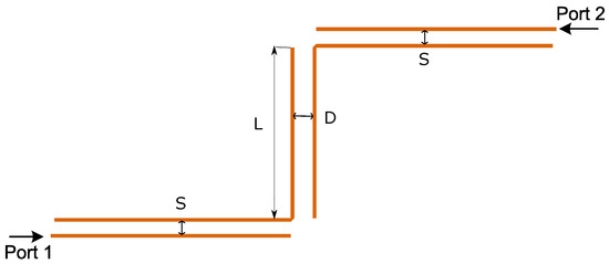 Since the bandwidth is very sensitive to the filter’s geometrical parameters, three design parameters are considered: the distance D, the length L of the two coupling parts and the gap S between the horizontal conductors (see Figure 8). These parameters are defined in the supports [0.2, 2] mm, [16, 20] mm and [0.1, 1] mm, respectively. The goal is to design a filter with passband in the range GHz. For simplicity, we only consider performance specifications imposed on the reflection coefficient (element of the filter scattering matrix). In order to achieve our optimization goal, the objective is formulated as follows:
