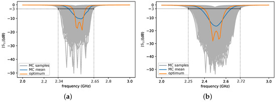 (a) Return loss of the zigzag bandpass filter using robust BO and (b) standard BO. (a) The optimal 3 dB bandwidth by the robust BO is [2.47, 2.58] GHz. MC analysis reveals, however, that it may extend up to [2.34, 2.65] GHz. (b) The optimal 3 dB bandwidth by the standard BO is [2.40, 2.61] GHz. MC analysis reveals, however, that it may extend up to [2.25, 2.72] GHz.