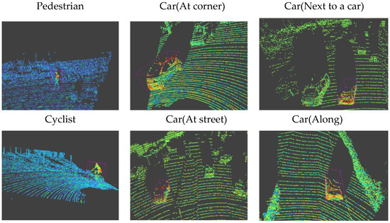 Because the dataset annotates only the objects that are visible in the image, the point cloud was processed within the field of view of the image. We performed all experiments on three objects: cars, pedestrians and cyclists. Three difficulty levels (easy, medium and hard) were considered depending on the size of the 3D object, occlusion level and truncation. For training purposes, samples that did not contain objects of interest were removed.