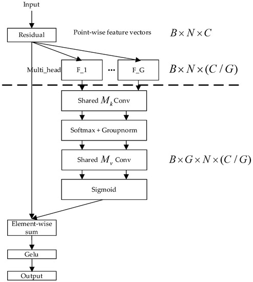 Traffic scenes have strong semantic correlations, such as the correlation between vehicles and road surfaces, driving directions while maintaining the same lane, and correlation between pedestrians and pedestrian crossings. The self-attention mechanism [17] captures long-range interactions and provides guidance for the selection of key points. It uses its contextual information for the classification task of the CG layer to create a positive effect. However, the self-attention mechanism is computationally expensive, which limits its use for complex datasets. Hence, a computationally cost-effective alternative that can simplify self-attention is needed.