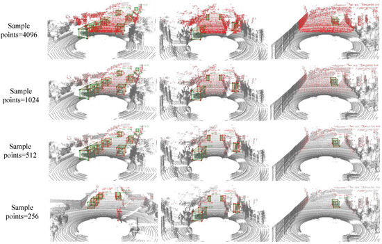 Sampling point recall. The detection performance and point recall, which is the ratio of the number of ground truth (GT) boxes with at least one internal sample point to all GT boxes for different samples, are compared in Table 4. The algorithm is based on the 3DSSD baseline. We adjusted only the point sampling policy; the other model settings remained unchanged. The results showed that our A-FPS outperformed the F-FPS used in the 3DSSD baseline by up to 2.28%. Furthermore, the candidates sampled by our A-FPS could “hit” 0.24% additional real boxes when compared with S-FPS. As can be seen from the visualisation results in Figure 7, FPS was used in Layer 1 and Layer 2 to obtain a uniform sampling point, whereas A-FPS was used in Layer 3 to ensure a greater concentration of the foreground points. Finally, the 256 sampling points output in the CG layer were almost entirely concentrated around the instances.