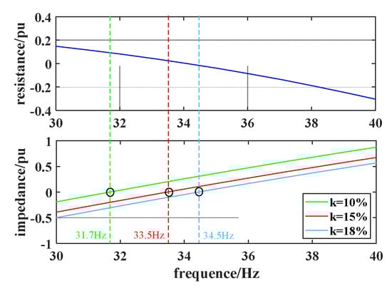 When Kp1 = 1.5 and Ki1 = 0.05, k is taken as 10%, 15%, and 18%, respectively. The frequency-impedance curves of the system derived from Equations (17)–(19) and (22) for three different SCDs are shown in Figure 8. At 10% SCD, the total system reactance undergoes a ZCP at 31.7 Hz. The total system resistance Rsum at this frequency is greater than zero, so the system remains stable; at 15% SCD, the total system reactance undergoes a ZCP at 33.5 Hz and the total system resistance Rsum at this frequency is greater than zero, so the system remains stable; at 18% SCD, the total system reactance undergoes a ZCP at 34.5 Hz. At this frequency, the total system resistance Rsum is less than zero, causing the system to undergo SSO. Therefore, a larger SCD indicates a greater susceptibility to SSO.