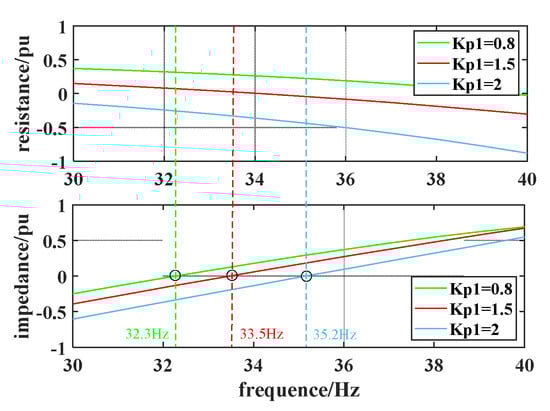 When K = 15% and Ki1 = 0.05, k is taken as 0.8, 1.5, and 2, respectively. The system frequency-impedance curves obtained from Equations (17)–(19) and (22) for the three proportionality coefficients are shown in Figure 9. When Kp1 = 0.8, the total system reactance undergoes a ZCP at 32.3 Hz. The total system resistance Rsum at this frequency is greater than zero, so the system remains stable; when Kp1 = 1.5, the total system reactance undergoes a ZCP at 33.5 Hz. The total system resistance Rsum at this frequency is greater than zero, so the system remains stable; when Kp1 = 2, the total system reactance undergoes a ZCP at 35.2 Hz. The total system resistance Rsum at this frequency is less than zero, causing the system to undergo SSO. Thus, a larger proportionality coefficient indicates a greater susceptibility to SSO.