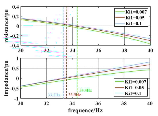 When K = 15% and Kp1 = 1.5, Ki1 is taken as 0.007, 0.05, and 0.1, respectively. The system frequency-impedance curves obtained from Equations (17)–(19) and (22) for three different integration coefficients are shown in Figure 10. When Ki1 = 0.007, the total system reactance undergoes a ZCP at 34.4 Hz. The total system resistance Rsum at this frequency is less than zero, causing the system to undergo SSO. When Ki1 = 0.05, the total system reactance undergoes a ZCP at 33.5 Hz. The total system resistance Rsum at this frequency is greater than zero, so the system remains stable; when Ki1 = 0.1, the total system reactance undergoes a ZCP at 33.2 Hz. The total system resistance Rsum at this frequency is greater than zero, so the system remains stable. Therefore, a smaller integration coefficient indicates a greater susceptibility to SSO.