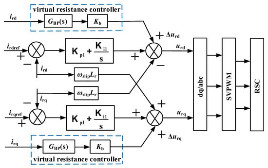 The structure of the attached virtual resistance controllers to RSC is shown in Figure 11. The rotor currents ird and irq are introduced into the current inner loop of the RSC as inputs to the two controllers of the virtual resistance via the band-pass filter GBP and the proportional component Kb, respectively. The positive virtual voltage Δur generated by the introduced ir offsets the negative disturbance voltage caused by the RSC control parameters at the SSO frequency.