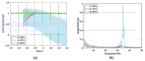 When Kp1 = 1.5 and Ki1 = 0.05, k is taken as 10%, 15%, and 18%, respectively. The analysis results of active power waveform and its FFT obtained by system simulation with different SCDs are shown in Figure 12. The system oscillation converges and finally stabilizes when the SCD is 10% and 15%, respectively; when the SCD is 18%, the system oscillation diverges. Figure 12b indicates that an 18% SCD leads to an SSO frequency component at 34.5 Hz. Thus, a larger SCD indicates a greater susceptibility to SSO. Therefore, the results obtained in Section 3.3.1 are verified.
