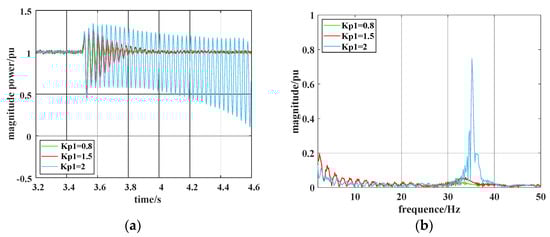 When Ki1 = 0.05 and k = 15%, Kp1 is taken as 0.8, 1.5, and 2, respectively. The analysis results of the active power waveform and its FFT obtained by system simulation with different proportionality coefficients are shown in Figure 13. When Kp1 is 0.8 and 1.5, respectively, the system oscillation converges and the system is stable at the end; when Kp1 = 2, the system oscillation diverges. Figure 13b indicates a SSO frequency component at 35.2 Hz when Kp1 = 2. Thus, a larger proportionality coefficient indicates a greater susceptibility to SSO. Therefore, the results obtained in Section 3.3.2 are verified.