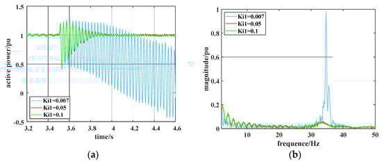 When Kp1 = 1.5 and k = 15%, Ki1 is taken as 0.007, 0.05, and 0.1, respectively. The analysis results of the active power waveform and its FFT obtained by system simulation with different integration coefficients are shown in Figure 14. When Ki1 is 0.007, the system oscillation diverges; when Ki1 is 0.8 and 1.5, the system oscillation converges and the system is stable at the end. Figure 14b indicates an SSO frequency component at 34.4 Hz when Ki1 = 0.007. Thus, a lesser integration coefficient indicates a greater susceptibility to SSO. Therefore, the results obtained in Section 3.3.3 are verified.