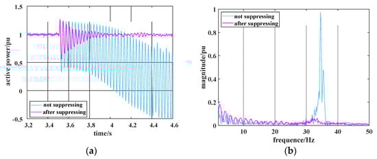 In this study, the time domain simulation method is used to study the influences of system parameters on system stability. In the analysis of system subsynchronous oscillation, FFT is usually used for transient waveform analysis [15,16,27]. The analysis results of the active power waveform and its fast Fourier transform (FFT) output from DFIG are obtained by introducing a series compensation capacitor at 3.5 s. It is verified that the system stability can be improved by optimizing the parameters. When SSO occur in the system at 3.5 s, the analysis results of the active power waveform and its FFT with and without the virtual resistance controllers are compared to verify the effectiveness of the proposed suppression strategy.