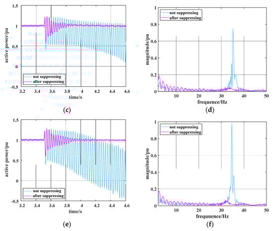 Section 3.3 shows that SSO occurs when SCDs, proportionality coefficients, and integration coefficients meet the following three cases, respectively: Case 1: k = 18%, Kp1 = 1.5, and Ki1 = 0.05; Case 2: k = 15%, Kp1 = 2, and Ki1 = 0.05; Case 3: k = 15%, Kp1 = 1.5, and Ki1 = 0.007. The virtual resistance controllers attached suppress the SSO occurring in the system in these three cases. The analysis results of the active power waveform and its FFT frequency with and without the virtual resistance controllers for the three oscillation cases are shown in Figure 15. Figure 15a, c and e suggest that the active power oscillation diverges when no suppression is applied. After the introduction of the virtual resistance controllers, the active power output from the system gradually converges and remains stable. Additionally, Figure 15 suggests that the SSO frequencies for the three oscillation cases are 34.5, 35.2, and 34.4 Hz, respectively, when no suppression is applied. Then, no SSO occurs in the system after the introduction of the virtual resistance controllers. Therefore, these results verify the effectiveness of the suppression strategy.