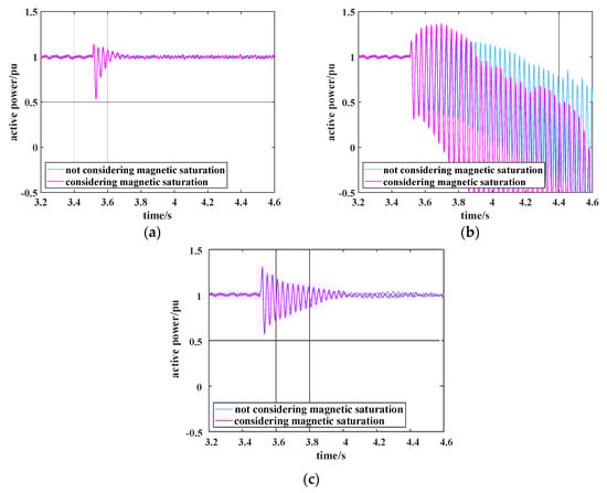 Comparison of the system active power under different Kp1 with and without magnetic saturation: (a) when Kp1 = 0.8, comparison of system active power with and without magnetic saturation; (b) when Kp1 = 2, comparison of system active power with and without magnetic saturation; (c) when Kp1 = 2, comparison of subsynchronous suppression of the system with and without considering magnetic saturation.