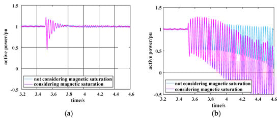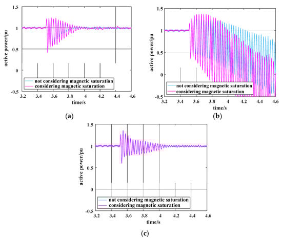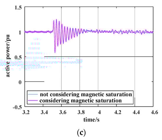 Comparison of the active power of the system with and without magnetic saturation under different k: (a) when k = 10%, comparison of the active power of the system with and without magnetic saturation; (b) when k = 18%, comparison of the active power of the system with and without magnetic saturation; (c) when k = 18%, comparison of subsynchronous suppression of the system with and without considering magnetic saturation.