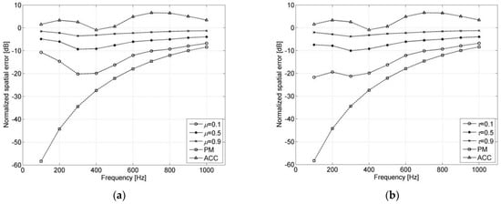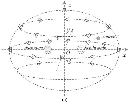 35], where a circular loudspeaker array is used to reconstruct the sound field of a nearby sound source. The pressure matching method is used to synthesize the incident acoustic field by minimizing the error between the desired and reconstructed sound fields, and the binaural control technique is used to reconstruct the interaural level differences (ILDs) and interaural time differences (ITDs). On the basis of the pressure matching method, Afghah et al. proposed replacing the traditional Tikhonov regularization method with the eigen decomposition pseudoinverse method to solve the loudspeaker distribution coefficient [