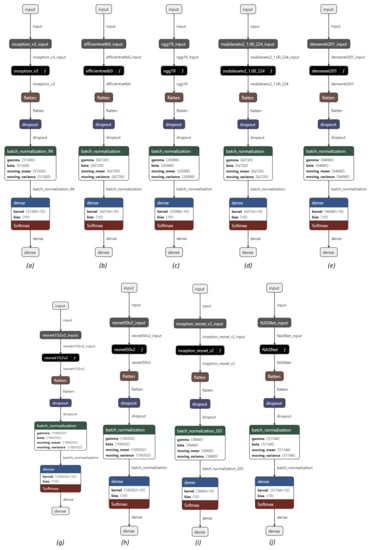 Modified blocks of pre-trained models after fine-tuning processes: (a)-InceptionV3, (b)-EfficientNetB0, (c)-VGG19, (d)-MobileNetV2, (e)-DenseNet201, (g)-ResNet152V2, (h)-ResNet50V2, (i)-InceptionResNetV2, and (j)-NasNetMobile. Where f refers to the basic pre-trained architecture in these models.