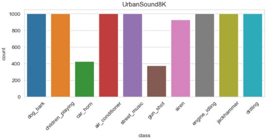 Dataset description. We utilized the Urbansound8K dataset to conduct these experiments [18]. It comprises 8732 labeled sound samples from ten different classes, each lasting for four seconds. Each clip is derived from field recordings made available at www.freesound.org (accessed on 3 November 2014). The audio data had already been split, excerpted, and assigned to ten distinct folds. We investigated the class distributions of each fold to assess the dataset’s balance; the bar graph in Figure 3 reveals that the dataset’s class names are relevant to the number of samples. This approach of imbalance analysis indicates that there are two classes with somewhat fewer entries than the other eight classes. As a result, it does not seem to be much out of balance. After that data-balance assessment, we extracted raw audio samples into log- Mel-spectrograms, as shown in Figure 4, to feed the chosen pre-trained CNN models. To prevent over-fitting issues, we used several data-augmentation strategies. Various data-augmentation strategies have already been used to solve particular challenges in the area of data augmentation [61]. This study used the Keras API to execute the spectrogram image-augmentation techniques. Increasing the number of data samples by utilizing just the information in this data is optimal for reducing model over-fitting. Therefore, to avoid over-fitting problems, we applied various data-augmentation techniques, such as flipping spectrograms horizontally and vertically [62], rotating 30 degrees [63], zooming to a 0.3 range [64], and shifting width by 0.3 [65] to enhance the data in this study. From 8732 original spectrogram images, 43,660 spectrogram images were generated. Spectrogram images were downsampled before feeding to the pre-trained networks to obtain the dimensions of 299 × 299 × 3 for InceptionV3, InceptionResnetV2, and 224 × 224 × 3 for other pre-trained models utilized in this study.