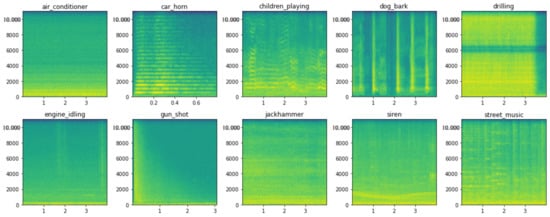 Spectrogram; log Mel-spectrogram. A spectrogram represents sound as a frequency spectrum of an audio stream evolving with time. Typically, the sound is depicted as a wave shape, which is a two-dimensional representation of the amplitude and time components. The fast Fourier transform (FFT) [66] is used to generate a sound spectrogram from a temporal signal. Spectrograms are two-dimensional graphs, with a third dimension being represented by colors. The third dimension represents the amplitude of a specific frequency at a particular moment. Figure 4 illustrates the sample spectrograms from each of the ten classes of the selected dataset used in this study.