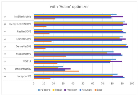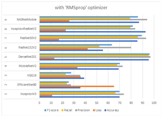 ‘RMSProp’ is a related optimization technique to ‘Adam’. However, ‘RMSProp’ with momentum is distinct from ‘Adam’ in several significant ways, such as ‘RMSProp’ with momentum creating parameter updates using momentum on the rescaled gradient. In contrast, ‘Adam’ directly updates using a running average of the first and second moments of the gradient. In addition, ‘RMSProp’ lacks a concept for bias correction [72]. In this study, these diversities have a substantial role in achieving greater performances in pre-trained models and some diversities between achieved results of the neural networks can be observed.