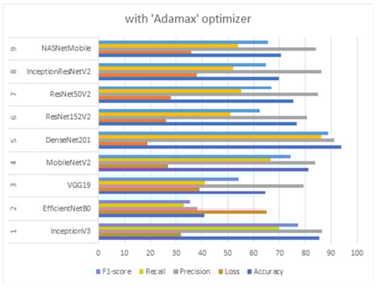 Then, all pre-trained models were retrained using the supplied dataset. A slightly higher accuracy was achieved by using the ‘Adam’ optimizer with DenseNet201, Res-Net50V2, and Inception-V3 models, respectively, 97.25%, 95.5%, and 92.5%. Additionally, inferior results were obtained with EfficientNetB0 when training with optimizers ‘Adamax’, ‘RMSprop’, and ‘Adam’. Furthermore, the VGG-19 model being trained with ‘RMSprop’ and ‘Adamax’ illustrates low accuracy. The detailed results are summarized in Table 2. The subsequent paragraphs will discuss all results and findings in further depth.