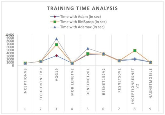 Residual neural networks achieve high-performance results by using skip connections to skip layers. Most ResNet models use double or triple layer skips with nonlinearities (ReLU) and batch normalization. Skip connections are used to prevent fading gradients or to reduce degradation. Figure 2g,h illustrate two residual network models that are used in this study. As shown in Table 2, ResNet152V2 and ResNet50V2 both perform well on the selected dataset, achieving excellent accuracy of 89.67%, 95.5% with the ‘Adam’, 55.45%, 85.5% with the ‘RMSprop’, and 76.75%, 75.25% with the ‘Adamax’ optimizer, respectively. Both of the residual network models have comparable accuracies, except that, when being trained with the ‘RMSprop’ optimizer, they differ by 32%. When comparing the training times of these models, a significant difference can be seen: ResNet152V2 needs much more training time than ResNet50V2. A comparison of the training times of these models is shown in Figure 8.