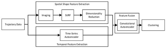 To sum up, this paper designs a trajectory clustering algorithm based on spatio-temporal features. Its main idea is shown in Figure 2. The temporal feature is extracted by building an autoencoder with a time series network according to the conventional methods. The spatial shape feature is designed separately, including the extraction process of imaging, image matching algorithm, and feature dimension reduction processing. Finally, an autoencoder is used to fuse the two features for clustering. The specific algorithm is described in detail below.