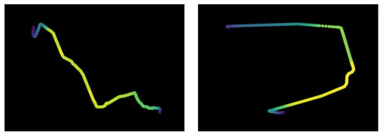 In this paper, the spatial shape features of the trajectory are extracted from the trajectory image, so the trajectory needs to be imaged first. Other properties such as speed, heading, and so on, can be extracted by the temporal network. Therefore, only the position information of the trajectory points needs to be considered in the imaging process. Thus, this paper normalizes the latitude and longitude coordinates of the trajectory, removes the relative position features, and only retains the shape features of the trajectory. When processing trajectory data with elevation attributes such as airplanes, the color of the trajectory points is used in the generated image to reflect the change of this elevation attribute. The graphical result is shown in Figure 3.