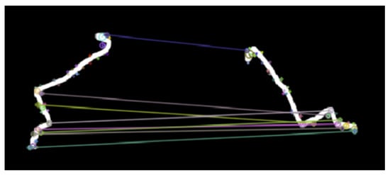 The principle of the SURF algorithm is simply to extract the sharply changing pixel points in the image as feature points; generate feature vectors according to the position, gradient, direction, and other factors of the feature points; and use this feature point vector to match each image. This method can mark the special points, such as the corners of the trajectory, in the image and reflect the shape characteristics of the trajectory, and because the main direction of each feature point is calculated in the process of generating feature points, this algorithm has rotation invariance. Even if the image is rotated, it will not affect the matching of feature points. The matching diagram is shown in Figure 4.