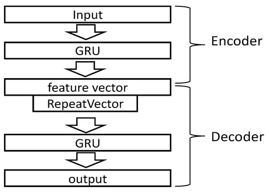 Trajectories are typical time series data, and temporal features are the critical information to distinguish the type of trajectory []. RNN is the mainstream neural network model for processing time series data. This paper uses the RNN variant network GRU (gated recurrent unit) [] to build a time series autoencoder. GRU is a model proposed to solve the long-term memory problem. The effect is similar to that of LSTM, but it has fewer parameters and performs well in time series data processing. The designed autoencoder network structure is shown in Figure 6.