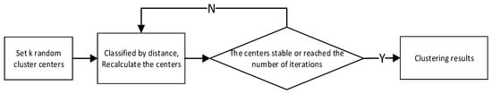 Finally, the distance matrix is clustered based on the K-means algorithm [], and the brief process is shown in Figure 9. Firstly, K cluster centers are randomly determined, and each sample point is assigned to the cluster represented by the closest cluster center point according to the similarity between each sample point and each cluster center. After all points are allocated, recalculate the new cluster center in each cluster, then re-divide all sample points according to the similarity, and repeat iteratively until the cluster center points remain stable or reach the pre-specified clustering number of runs.