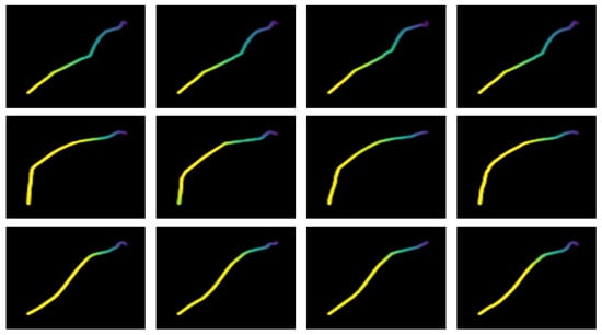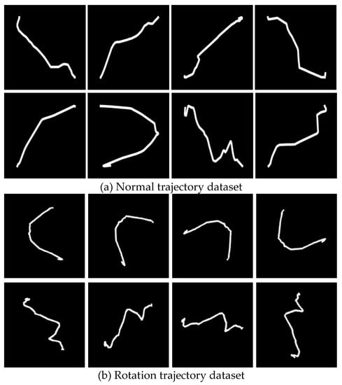 In addition, as introduced in the problem analysis in Section 2, trajectory shape feature extraction needs to ensure that the extraction method is robust to transformations such as rotation and scaling of the trajectory. However, since the position attribute is normalized in the imaging process, there is no need to study the scaling change of the trajectory. Therefore, based on the simulation dataset, the dataset formed by the rotation transformation of the trajectory is shown in Figure 10b, which is used to further verify the algorithm’s ability to extract spatial features in the trajectory image with rotational changes.