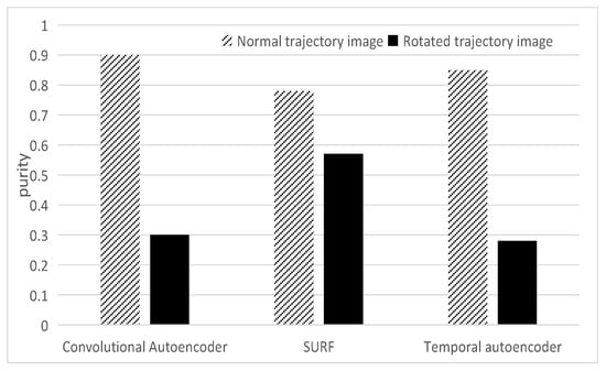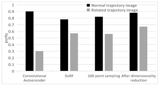 As shown in the Figure 11, in the general trajectory dataset, both the convolutional autoencoder and the temporal autoencoder can effectively read trajectory features and obtain good clustering results. However, the performance degrades rapidly when the rotation of the trajectory image appears. The SURF method is more robust to rotation changes. It shows apparent advantages in rotating datasets, which proves that the SURF method is more suitable for extracting the spatial features of the trajectory image under unsupervised conditions. Therefore, this paper chooses the SURF algorithm to extract the spatial features of the trajectory.