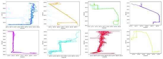 In order to further verify the generality of the algorithm, this paper selects eight types of high-quality data, as shown in Figure 16, from the GeoLife dataset, and it uses the user as the label in the experimental data. The data includes three different modes of transportation: walking, cycling, and driving. As can be seen from the images, these motion patterns have their own characteristics and are more complex than civil aircraft data, so they can better test the effect of the algorithm on different trajectories.