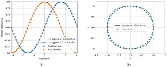 Summary of 1st approximations of sin-function and cos-function. (a) First approximation of sin and cos functions by RCM. (b) Comparison with unit circle.