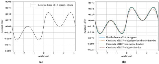 Here, we consider the sin-function and evaluate the residuals of the first approximation. The residuals of the first approximation have the shape of an odd function, as shown in Figure 2a. The following RCF candidates obtained by the multiply–add operation can be considered for this residual: