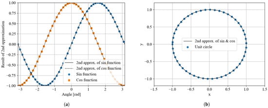 For the second approximation of the trigonometric functions, Equations (3) and (4) are considered good approximations, and the error and computational cost are as shown in Table 3. The final error is less than 0.001 for the entire definition region, and the computational cost is very low.