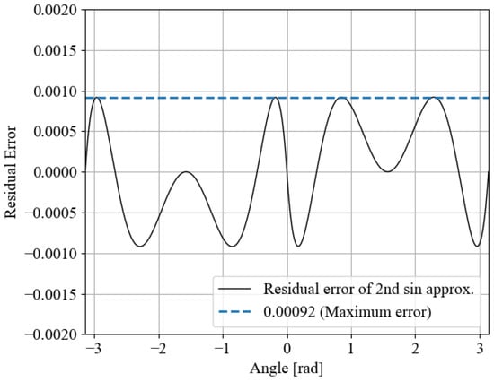 To evaluate the performance of the second approximation, the final residuals and computation time are shown in Figure 4 and Table 1. The final residual is, at most, approximately 0.00092, which is sufficiently small when compared with the first approximation. The computation time was evaluated using an Intel Xeon E3 (2500 MHz) CPU. As a result, the processing time was 1.4 ns for the sine’s approximation and 2.04 ns for the cosine’s approximation, which is approximately twice as long as the first approximation, but more than 30 times faster than the built-in functions in math.h.