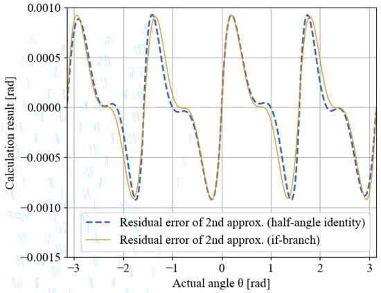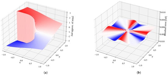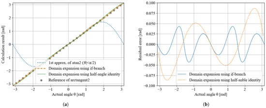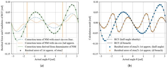 Figure 6b shows the case where is evaluated with the same RCF, and this RCF can always be applied if a good approximation is obtained in the first approximation. Therefore, other atan2 approximation methods, such as DSP-Trick, for example, are also RCFs that can be made highly accurate.