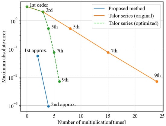 As mentioned in Introduction, the Taylor series is slow to converge but can compute mathematically exact values of trigonometric functions. We compare the Taylor series and the proposed method in the domain of definition . Taylor series are evaluated from the first to the ninth order. In addition, the computational cost is evaluated based on the definition formula and the following formula expansion to reduce the number of multiplications for embedding.