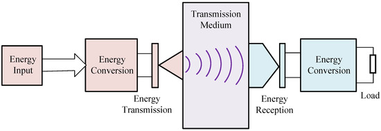 Wireless power transfer (WPT) technology, also known as contactless power transfer (CPT) technology, refers to the technology that uses a kind of field or wave to achieve effective electrical energy transmission over a certain distance without using wires or conductors [6,7,8,9]. WPT technology was first proposed by Nikola Tesla, a Serbian–American scientist, and is currently focused on connecting the power source and load without electrical contact [10]. It achieves electrical energy transmission by means of an indirect form of energy, and the principle is shown in Figure 1. On the transmitting side, the energy conversion device converts the electrical energy into another form of energy and transmits it through the medium. On the receiving side, the energy conversion device converts the received energy back to electrical energy again, and the electrical energy is processed and powers the load.